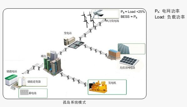 孤島系統模式是BESS與一個或多個發電系統并聯形成一個局部的“微網”。孤島系統的主要特征是局部電網與大電網脫離,BESS的額定功率與局部電網產生的總功率大致相等。在這個系統中,BESS必須可以充當網路電源,給“微網”提供電壓和頻率控制。