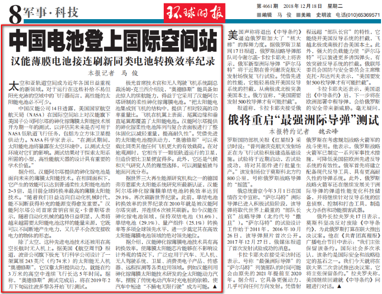 12月18日,據(jù)《環(huán)球時(shí)報(bào)》報(bào)道,美國國家航空航天局(NASA)正在國際空間站測試一項(xiàng)太陽能電池技術(shù),評估未來是否可用于NASA低地球軌道飛行任務(wù),包括為立方體衛(wèi)星(CubeSats)提供動(dòng)力。報(bào)道顯示,被NASA選用于國際空間站的太陽能技術(shù),是來自我國高科技能源企業(yè)漢能旗下美國子公司Alta Devices(漢能阿爾塔)的砷化鎵薄膜太陽能電池。