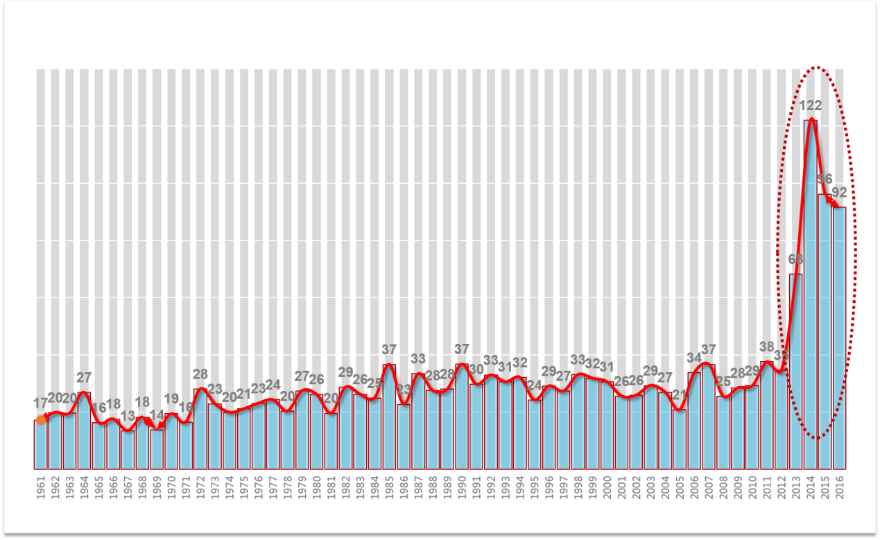 圖:山東省歷年霧天數和霾天數之和,2013年之后是明顯的突變