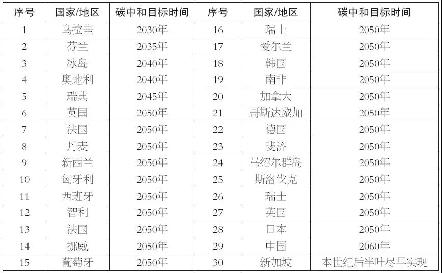 2020年9月22日,國家主席習近平在第七十五屆聯合國大會一般性辯論上發表重要講話時提出,中國將采取更加有力的政策和措施,二氧化碳排放力爭于2030年前達到峰值,努力爭取2060年前實現碳中和。盡管還未明確實現碳中和的具體路徑,但作為全球最大的碳排放和能源消費主體,我國實現碳中和需要能源系統的顛覆性變革,必須從以化石能源為主轉向以可再生能源為主。從全球范圍來看,目前世界上已有30多個國家以政策宣誓或法律規定等不同方式設定了各自的碳中和目標時間,如表1所示,碳中和目標時間較早的國家包括烏拉圭和芬蘭等,分別設定了2030年和2035年實現碳中和。從表1可看到,絕大多數國家將碳中和目標時間設定在了2050年,我國是2060年,新加坡則設定在了本世紀后半葉早期。