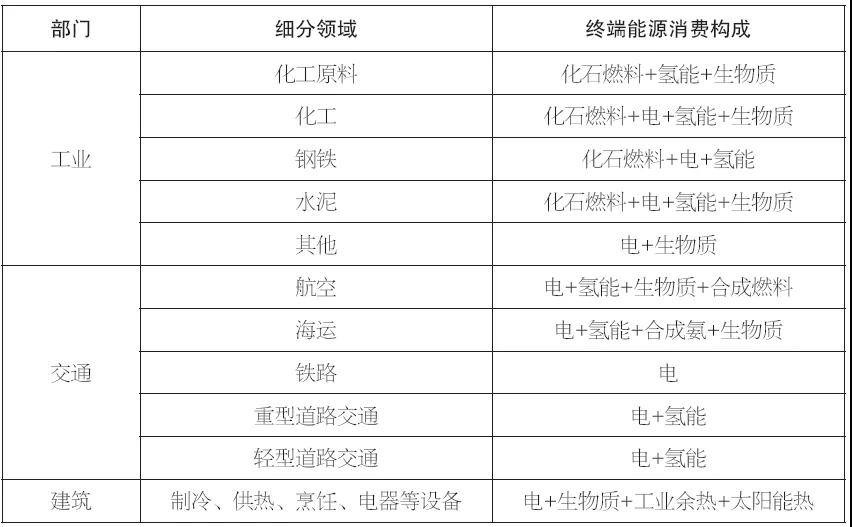 2.交通部門。為了實現我國交通部門的碳中和,需要將路面運輸(公路和鐵路服務)全面電氣化,同時長途航空和船運改用零碳燃料(氫氣、氨等)。1)路面交通。目前,我國高鐵已基本實現了全面電氣化,普通速度的鐵路交通在未來也將逐步實現全面電氣化。純電動汽車將在未來主導中短距離的交通出行,而氫燃料電池汽車則會在長距離貨運卡車和重型卡車中占據主要地位。2)航空和海運。針對航空海運領域,直接應用電氣化實現碳中和的空間較小,因此,航空和海運交通的脫碳則必須主要依靠零碳的新型燃料。對于航空領域,依靠生物航空燃油和合成航空燃油是實現碳中和的主要技術路徑。此外,未來需要使用生物燃料和氨對船運領域進行深度脫碳。綜上,零碳電能、氫能、航空燃油、生物燃料和氨等多種綜合能源的使用將會進一步加速我國碳中和目標的實現。