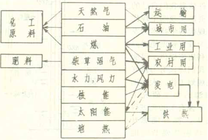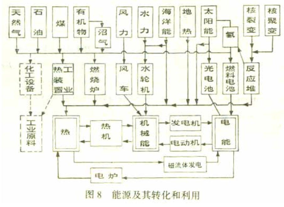 圖8表示各種能源經(jīng)過各種設(shè)備把它們轉(zhuǎn)化為各種不同形式的能來使用。圖的左邊是各種能源,右邊是各種使用形式,中間是各種轉(zhuǎn)化過程。從上面往下,天然氣、石油、煤、有機(jī)物(如薪炭、農(nóng)作物秸稈)都是常規(guī)能源,水力和風(fēng)力也算是常規(guī)能源。