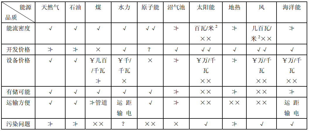 能源有很多種,各有優(yōu)缺點(diǎn)。評(píng)價(jià)能源品質(zhì)的指標(biāo)主要是: