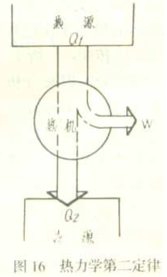 除了第一定律以外,分析熱機(jī)很重要的是熱力學(xué)第二定律,能源充分利用與否還要用熱力學(xué)第二定律。下面用圖16來說明熱力學(xué)第二定律。