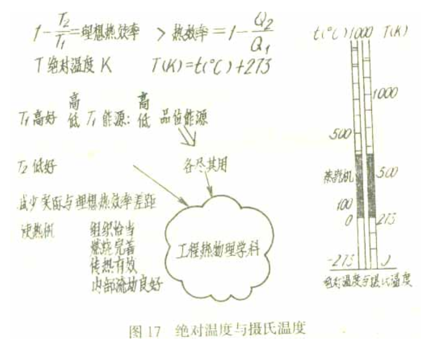 注意式中T是絕對(duì)溫度,不是攝氏溫度。在一個(gè)大氣壓下,水在0℃時(shí)結(jié)冰,在100℃時(shí)沸騰成蒸汽。絕對(duì)溫度的度數(shù)是攝氏溫度加上273,所以它的零度是-273℃(見圖17)。計(jì)算上式時(shí),攝氏溫度要換算成絕對(duì)溫度。T高,即能源產(chǎn)生蒸汽的溫度高,叫作高品位能源,這也就是高品位的含義。