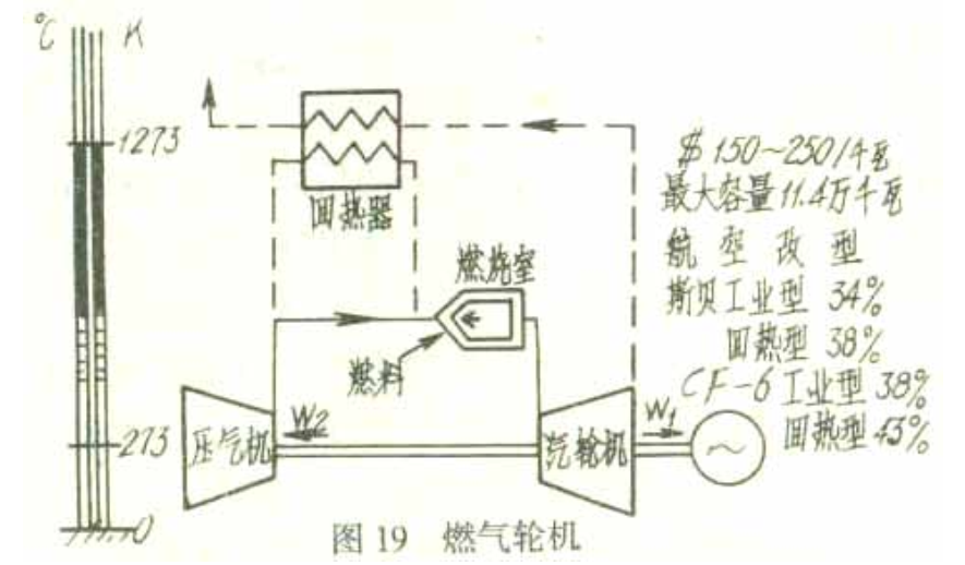 圖19表示一個(gè)不帶回?zé)崞骰蛘邘в谢責(zé)崞鞯娜細(xì)廨啓C(jī)的示意圖。上邊講了,空氣先通過壓氣機(jī),提高壓力,再到燃燒室,提高溫度,最后到氣輪機(jī)膨脹輸出功,它的工作溫度范圍表示在左邊的溫度圖上。