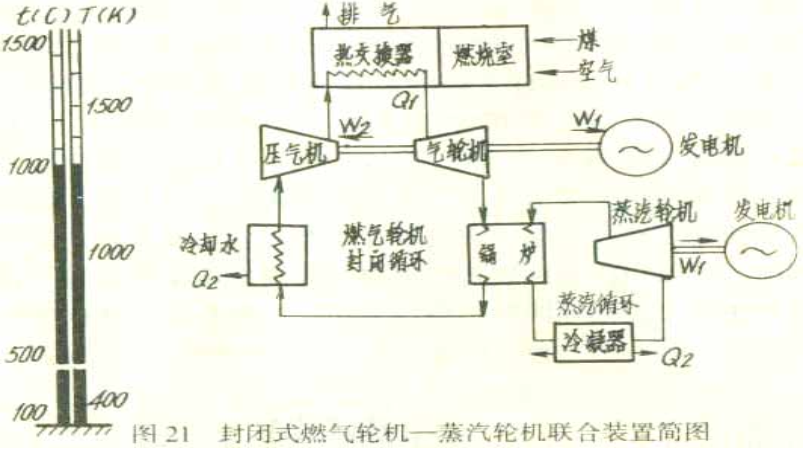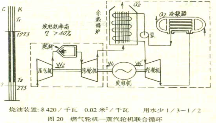 燃?xì)廨啓C(jī)又可以與蒸汽輪機(jī)聯(lián)合起來,成為一個(gè)聯(lián)合循環(huán)裝置。圖20、21是燃?xì)廨啓C(jī)和蒸汽輪機(jī)聯(lián)合裝置的示意圖。