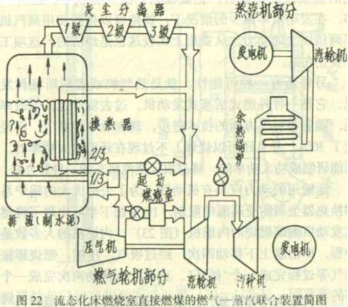 這種聯(lián)合裝置在發(fā)電上已大力發(fā)展。因?yàn)槿細(xì)廨啓C(jī)可以在高溫下使用,它是在機(jī)內(nèi)燃燒,與蒸汽輪機(jī)不一樣,對(duì)氣輪機(jī)葉片采取冷卻措施,可以耐受高的溫度,在1000℃以上的高溫下工作。它的排氣溫度為500~600℃,也比較高,正好可以到余熱鍋爐中去產(chǎn)生蒸汽,帶動(dòng)蒸汽輪機(jī)工作,蒸汽最后在冷凝器中以接近大氣的溫度冷凝成水。因此它可以在1000℃與20~30℃的溫度范圍內(nèi)工作,所以熱效率高。目前聯(lián)合循環(huán)發(fā)電效率已經(jīng)超過46%,是一般蒸汽輪機(jī)做不到的。這是熱機(jī)發(fā)展的方向。在國外這樣的聯(lián)合裝置,燃?xì)廨啓C(jī)燒的是天然氣或油,有的工業(yè)生產(chǎn)過程中就有副產(chǎn)品可燃?xì)怏w,可以用作這種裝置的燃料。我國發(fā)電全要燒煤。目前國外正在大力研究兩種燒煤的辦法:一種是流態(tài)化床燃燒室(見圖22),另一種是把煤氣化后,送到燃燒室里燃燒。