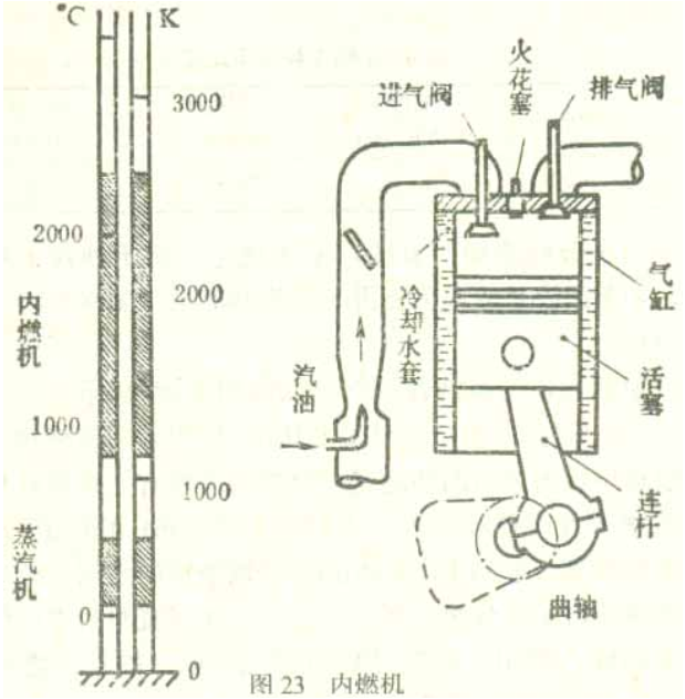 運(yùn)輸用的動(dòng)力應(yīng)具有機(jī)動(dòng)性。為了去掉龐大的鍋爐系統(tǒng)和換熱器金屬耐受高溫的限制,19世紀(jì)下半葉出現(xiàn)了將燃料在發(fā)動(dòng)機(jī)內(nèi)部燃燒的內(nèi)燃機(jī)(圖23),內(nèi)燃機(jī)的大多數(shù)是四沖程,即活塞上下移動(dòng)四次,經(jīng)過吸氣、壓縮、燃燒膨脹、排氣等過程完成一個(gè)“循環(huán)”。也有上下移動(dòng)兩次完成一個(gè)循環(huán)的,叫作二沖程。因?yàn)檫@種熱機(jī)間歇地短時(shí)間接觸燃燒氣體,并且采取冷卻措施,所以可以采用較高的(瞬時(shí))燃燒溫度如表5所示。