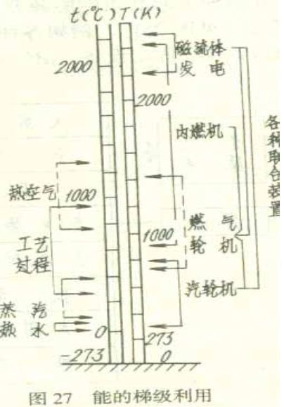 8、在能源利用方面,應(yīng)該按照基本科學(xué)原理,按照能的不同品位,按照各盡其用的原則來進(jìn)行,例如根據(jù)熱源溫度的高低選擇適當(dāng)?shù)臒釞C(jī)和熱裝置,大力發(fā)展各種聯(lián)合循環(huán)與熱電并供,余能利用等(見圖27)。