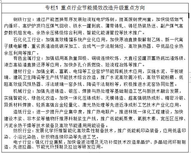 聚焦重點(diǎn)用能行業(yè)和用能領(lǐng)域,分業(yè)施策,分類推進(jìn),加快技術(shù)推廣,強(qiáng)化對標(biāo)達(dá)標(biāo),系統(tǒng)提升能效水平。
