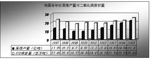 圖1列出了不同年份我國原煤產量及SO2排放量之間的關系。