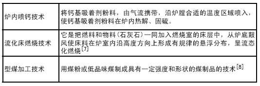 主要的燃燒中固硫方法見表2