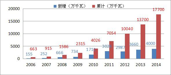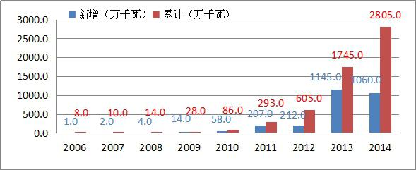 我國的光伏發電裝機容量2005年僅為7萬KW左右,相比歐美等西方發達國家,我國的光伏發電產業起步較晚,但發展很快,到2014年發電裝機已達到2805萬千瓦,與“十一五”末的2005年相比增長了400倍。