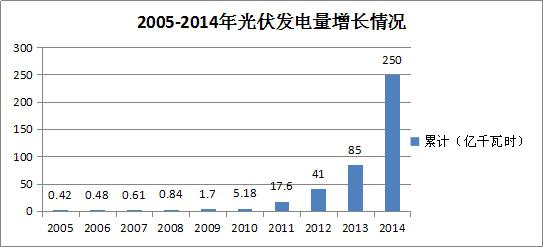 我國的光伏發電量2005年僅為0.42億KWH,到2014年已達到250億KWH,比2005年增長了近595倍,雖然基數非常小,但是增長速度非常快。