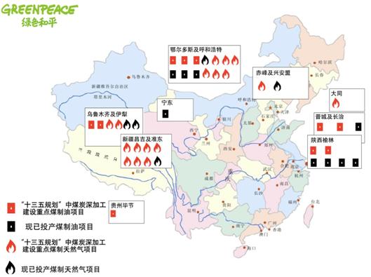 “規(guī)劃”列出了重點建設的煤化工項目及區(qū)域。根據(jù)綠色和平的統(tǒng)計,符合“規(guī)劃”中重點建設范圍和條件的煤制油、煤制氣項目產(chǎn)能總計約為2050萬噸和737.25億立方米,也遠遠超出了“規(guī)劃”所限定的1300萬噸煤制油和170億立方米煤制氣的總量。