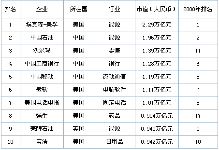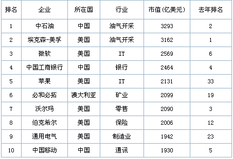 截至2010年3月31日,中石油市值達(dá)3293億美元,比第二名?松叱130多億美元。微軟名列第三,中國工商銀行則以2464億美元的市值緊隨其后。