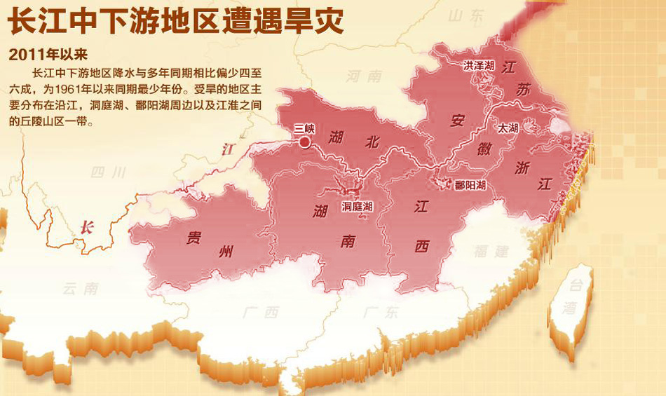異常天氣現象是造成長江中下游嚴重干旱的“禍首”。湖北省氣象局武漢區域氣候中心副主任周月華說,受拉尼娜氣候現象(赤道太平洋東中部海面溫度持續異常偏冷)的影響,自去年底以來大氣環流出現異常。西太平洋副熱帶高壓勢力整體偏弱,暖濕氣流無法深入到長江中下游地區,造成長江中下游大部分地區降雨偏少。但一些基層水利干部反映,天災之外還有不少人為影響因素…
