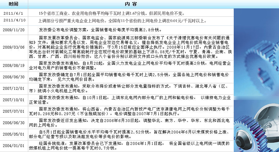 國內歷次電價格調整一覽表
