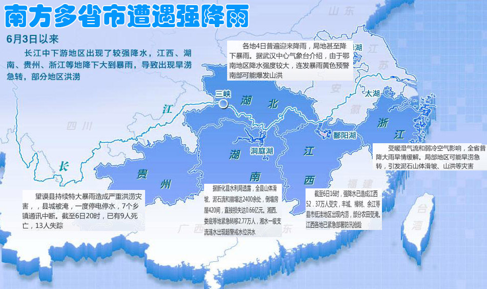 6月3日-7日 強降雨致南方旱澇急轉:持續強降雨致浙江、江西、貴州等地旱澇急轉,據氣象部門預報,長江中下游或再次迎來強降水。