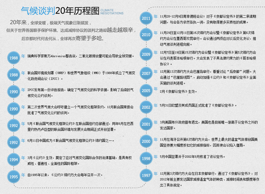 1:大會取得的最大成果是,最終就2013年起執行《京都議定書》第二承諾期達成了一致;第二承諾期時限的5年和8年之爭,最終以8年期限達成一致。
