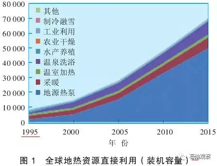 直接利用是指利用中低溫地熱資源進行采暖、制冷、醫(yī)療、旅游、工業(yè)烘干和農(nóng)業(yè)養(yǎng)殖等。經(jīng)過多年的發(fā)展,地熱資源的直接利用已經(jīng)從小范圍的獨立使用,逐步發(fā)展為大規(guī)模的應用工程。根據(jù)WGC的數(shù)據(jù)以及各個國家提供的資料,2015年世界范圍內(nèi)地熱資源各種直接利用方式如圖1所示。可以看出近二十年來,各種地熱資源直接利用量均有顯著的變化,特別是地源熱泵技術利用和供暖利用量增長十分迅速。