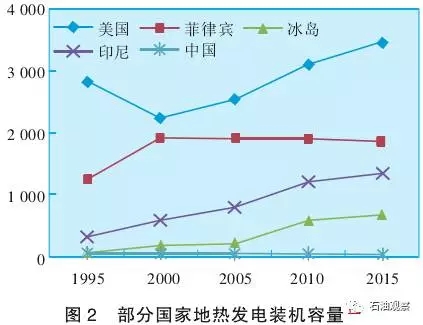 和地熱直接利用相比,地熱發(fā)電的增速較為緩慢。其主要原因是地熱發(fā)電投資成本高,技術難度大。再加上石油危機過后發(fā)達國家能源供應保障程度增強,發(fā)展地熱發(fā)電的迫切性有所下降,造成地熱發(fā)電增速下降。部分國家地熱發(fā)電裝機容量見圖2。