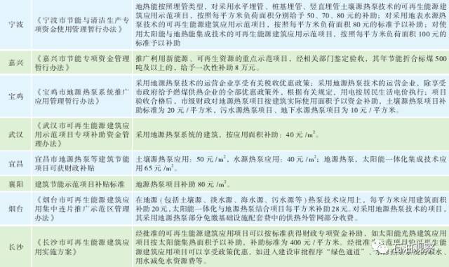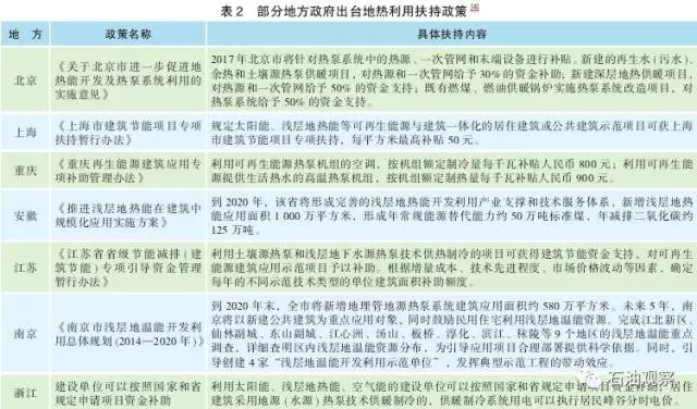 為促進地方地熱資源開發(fā)利用,部分地方政府也出臺了一系列政策,這些政策包括針對地熱資源的管理辦法、條例以及工程實施方案。如《北京市地熱資源管理辦法》《天津市地熱資源管理辦法》《云南省地熱資源管理條例》和《內(nèi)蒙古地熱資源管理條例》等。針對地熱項目投資高,投資回收期長影響投資積極性等現(xiàn)象存在,部分地區(qū)出臺了一些財稅補貼政策,參見表2。
