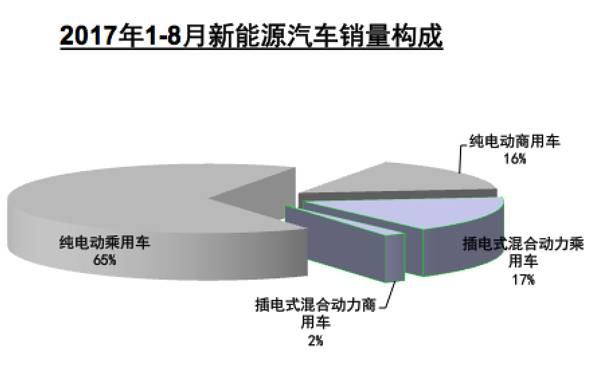 2017年新能源汽車市場整體靠乘用車支撐,8月新能源乘用車更是取得了單月最高銷量,達到5.5萬輛。前8月新能源乘用車共銷售26.11萬輛,占新能源汽車銷售總量的81.6%,其中純電動乘用車20.9萬輛、插電式混合動力乘用車5.23萬輛。