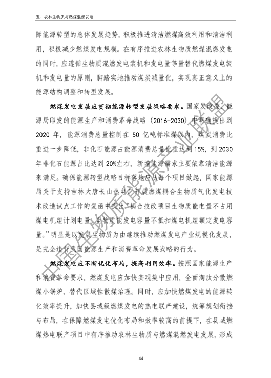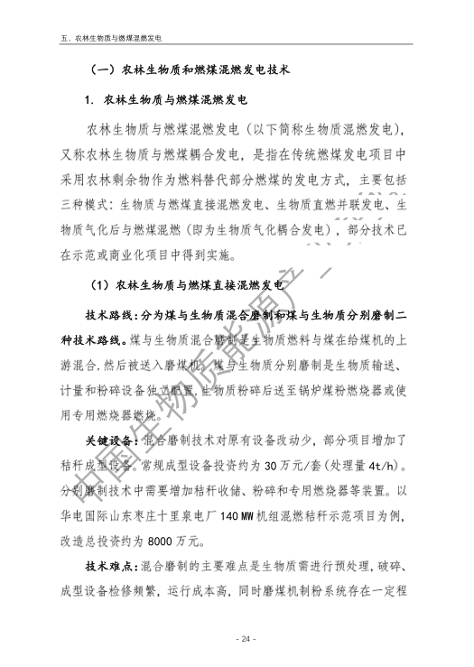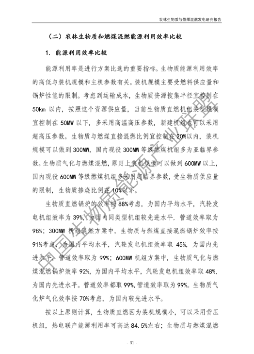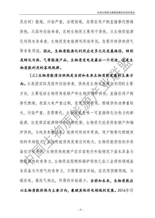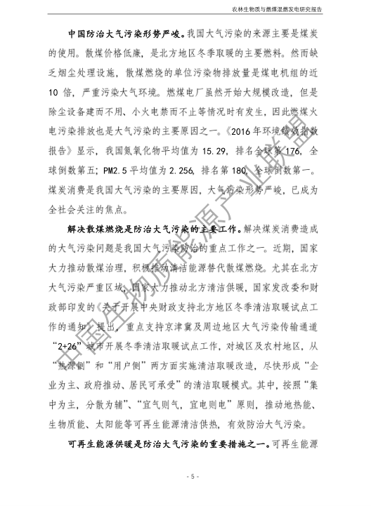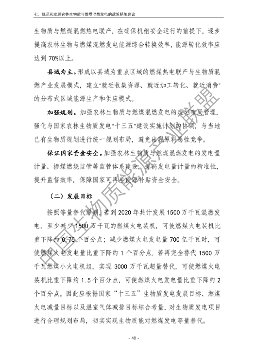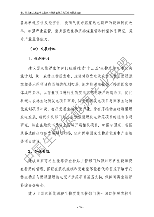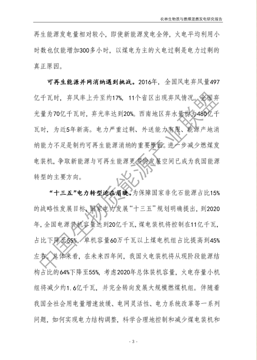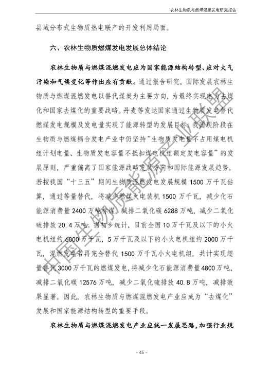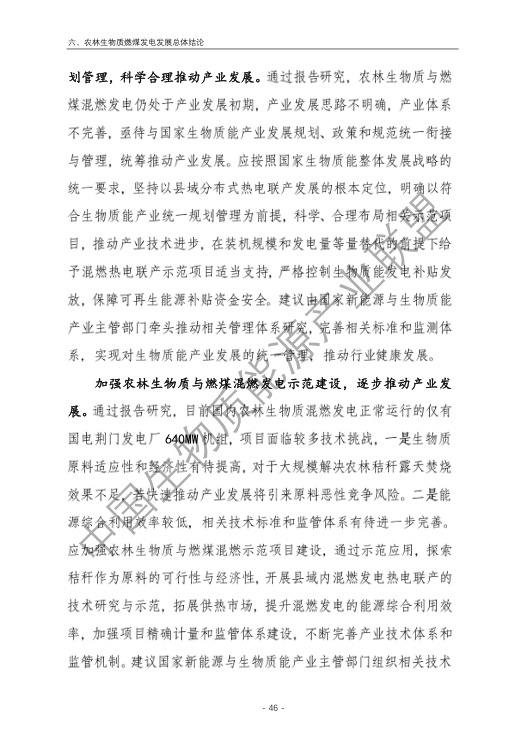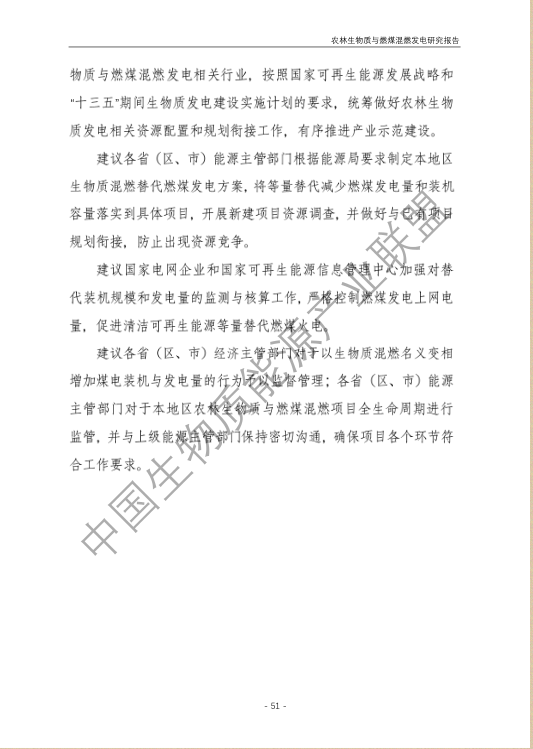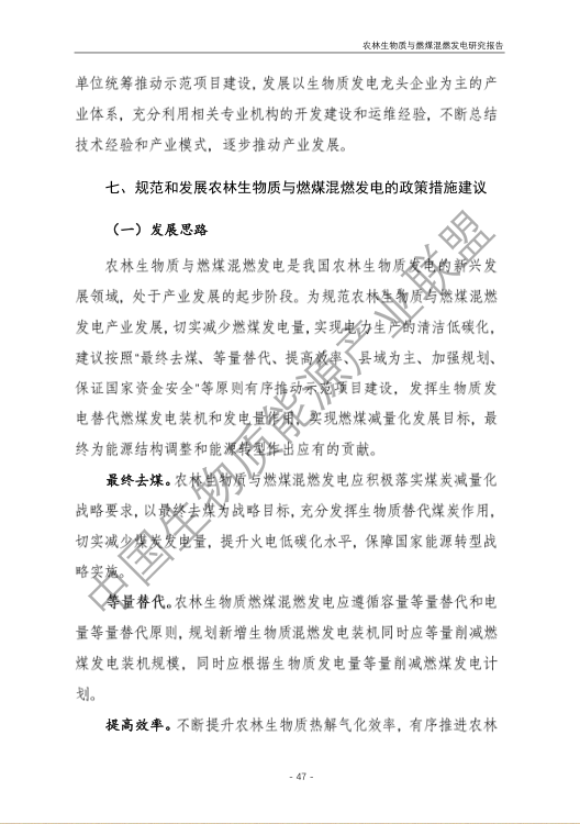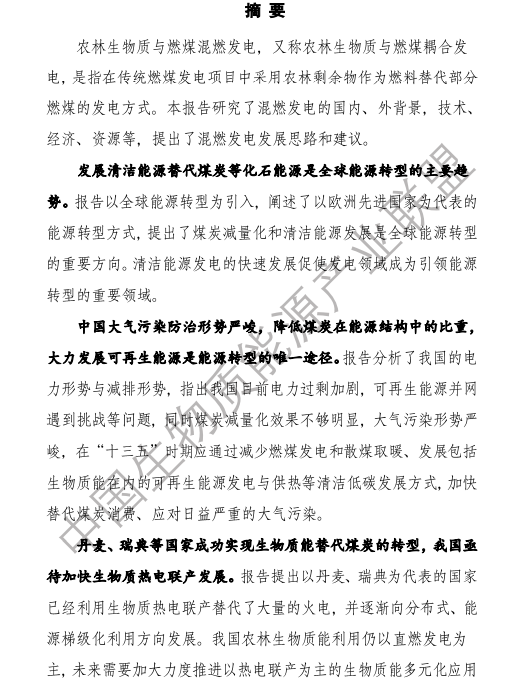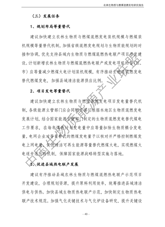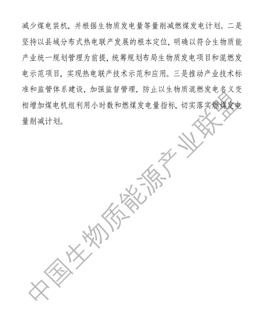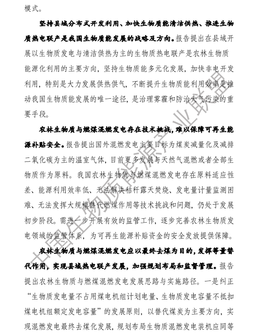 6.農(nóng)林生物質(zhì)與燃煤混燃發(fā)電應以最終去煤為目的,發(fā)揮等量替代作用,實現(xiàn)縣城熱電聯(lián)產(chǎn)發(fā)展,加強規(guī)劃布局和監(jiān)督管理。報告提出農(nóng)林生物質(zhì)與燃煤混燃發(fā)電發(fā)展思路與實施路徑。一是糾正生物質(zhì)發(fā)電量不占用煤電機組計劃電量、生物質(zhì)發(fā)電容量不抵扣煤電機組額定發(fā)電容量”的發(fā)展原則,以替代煤炭為主要方向,實現(xiàn)混燃發(fā)電最終去煤化發(fā)展,規(guī)劃布局生物質(zhì)混燃發(fā)電裝機應同等減少煤電裝機,并根據(jù)生物質(zhì)發(fā)電量等量削減燃煤發(fā)電計劃。二是堅持以縣域分布式熱電聯(lián)產(chǎn)發(fā)展的根本定位,明確以符合生物質(zhì)能產(chǎn)業(yè)統(tǒng)一規(guī)劃管理為前提,統(tǒng)籌規(guī)劃布局生物質(zhì)發(fā)電項目和混燃發(fā)電示范項目,實現(xiàn)熱電聯(lián)產(chǎn)技術示范和應用。三是推動產(chǎn)業(yè)技術標準和監(jiān)管體系建設,加強監(jiān)督管理,防止以生物質(zhì)混燃發(fā)電名義變相增加煤電機組利用小時數(shù)和燃煤發(fā)電量指標,切實落實烯煤發(fā)電量削減計劃。