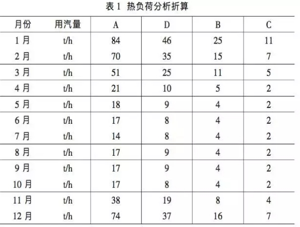 考慮汽水換熱站側(cè)換熱系數(shù)和管道供熱系數(shù)均為0.95,并依據(jù)《城鎮(zhèn)供熱管網(wǎng)設(shè)計規(guī)范》(CJJ34-2010),考慮5%的蒸汽管網(wǎng)損失和焓降后,折算到抽凝機抽汽參數(shù)為:P=0.8MPa˙a;t=290.4°C,背壓機供熱參數(shù)為0.8MPa、280°C,各用戶熱負(fù)荷折算后各月的用汽量如表1。