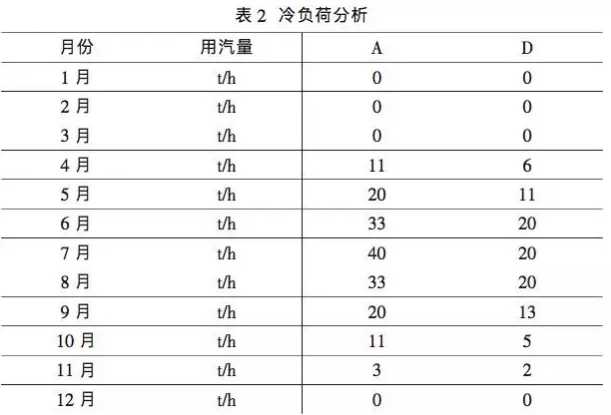 本工程冷負(fù)荷優(yōu)先利用熱網(wǎng)加熱器換熱后的冷凝水進行制冷,提供空調(diào)用冷凍水,其余不足部分采用蒸汽雙效型溴化鋰機組進行補充。各用戶冷負(fù)荷折算后各月的用汽量如表2。