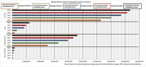 在過(guò)去十年間,全球木屑顆粒市場(chǎng)有了顯著的增長(zhǎng)。聯(lián)合國(guó)糧食及農(nóng)業(yè)組織(FAO)的數(shù)據(jù)顯示,最近五年的增長(zhǎng)率每年約為9.3%:從2012年約1950萬(wàn)噸增加到2016年約2860萬(wàn)噸。歐洲仍然是全球最大的木屑顆粒生產(chǎn)地。