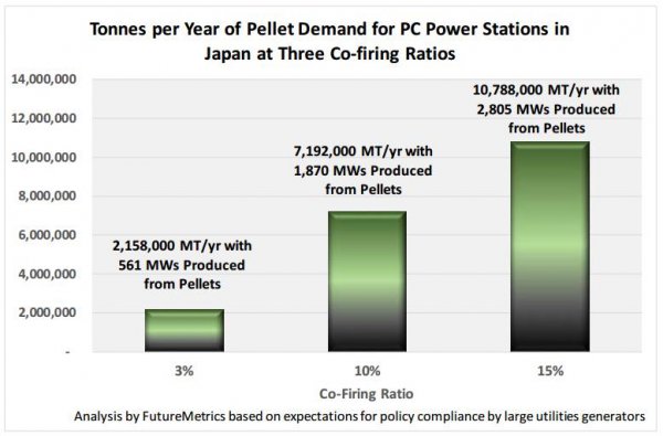 為了滿(mǎn)足2030年的需求,日本生物質(zhì)發(fā)電裝機(jī)容量不得不超過(guò)6,000MWs。如果這6,150MWs中的30%(即1,845 MWs)是由顆粒產(chǎn)生的話(huà),那么日本每年將消耗約740萬(wàn)噸顆粒。這一水平與10%的共燒比率是一致的。