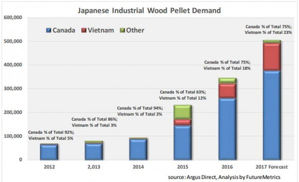 圖表顯示了2016年的實(shí)際需求和2017年的預(yù)測(cè)需求。加拿大繼續(xù)是日本木屑顆粒的主要供應(yīng)國(guó),預(yù)計(jì)將成為到2020年的主要供應(yīng)國(guó)。
