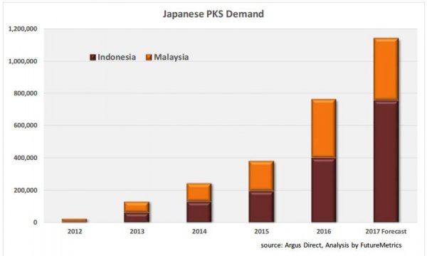 日本目前的生物質(zhì)需求量中有相當(dāng)一部分是通過(guò)進(jìn)口棕櫚仁殼(PKS)來(lái)滿(mǎn)足的。 進(jìn)口到日本的PKS如圖表所示。所有進(jìn)口到日本的PKS都來(lái)自印度尼西亞或馬來(lái)西亞。