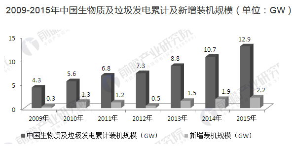 2009-2015年中國生物質及垃圾發電累計及新增裝機規模(單位:GW)