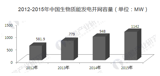 2012-2015年中國生物質能發電并網容量(單位:MW)