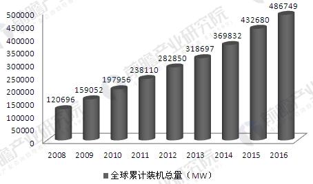 2008-2016年全球風電累計裝機容量(單位:MW)