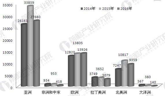 2014-2016年全球風電新增裝機區域結構(單位:MW)