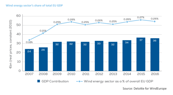 盡管如此,2016年,歐洲風能產業為歐盟GDP創收361億歐元,占歐盟GDP總量的0.26%。