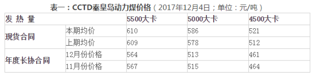 本報告期(11月25日至12月1日,見表一),“CCTD秦皇島動力煤價格”所采集的環(huán)渤海地區(qū)各種現(xiàn)貨動力煤價格整體上呈現(xiàn)止跌跡象,低熱值現(xiàn)貨動力煤價格則略有回升。其中,CCTD5500報收于610元/噸,比11月27發(fā)布的價格上漲了1元/噸;CCTD5000報收于586元/噸,比11月27發(fā)布的價格上漲了8元/噸。