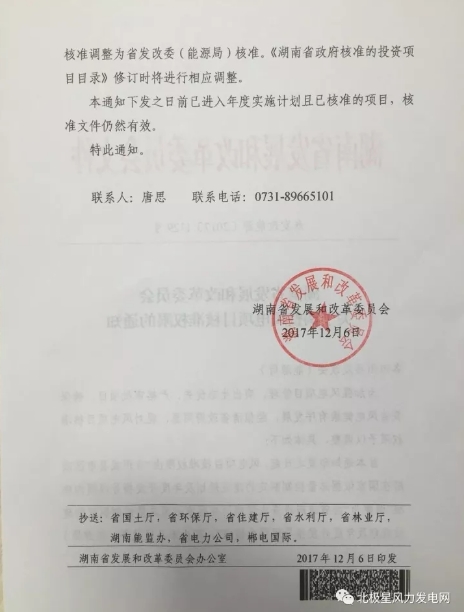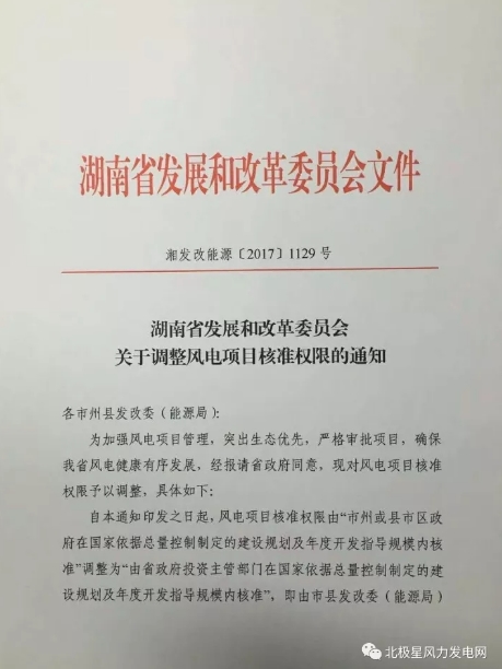 湖南省發(fā)改委今日印發(fā)《關(guān)于調(diào)整風電項目核準權(quán)限的通知》。文件指出,自通知印發(fā)之日起,風電項目核準權(quán)限由市縣發(fā)改委(能源局)核準調(diào)整為省發(fā)改委(能源局)核準。通知下發(fā)之日前已進入年度實施計劃且已核準的項目,核準文件仍然有效。以下為通知原文: