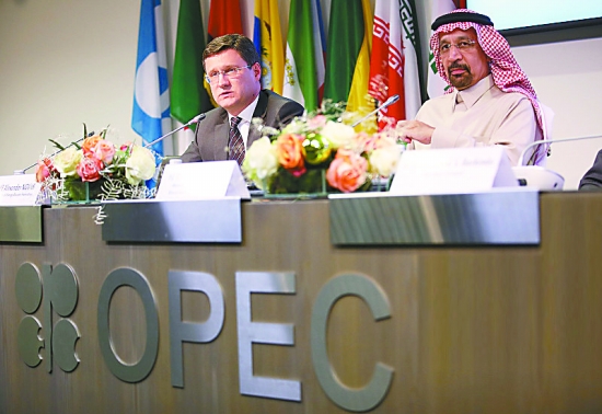 11月30日,歐佩克在維也納舉行第173屆半年度的部長級(jí)會(huì)議,圖為俄羅斯能源部部長諾瓦克(左)及沙特能源大臣法利赫(右)在會(huì)議上發(fā)言。(來源:視覺中國)