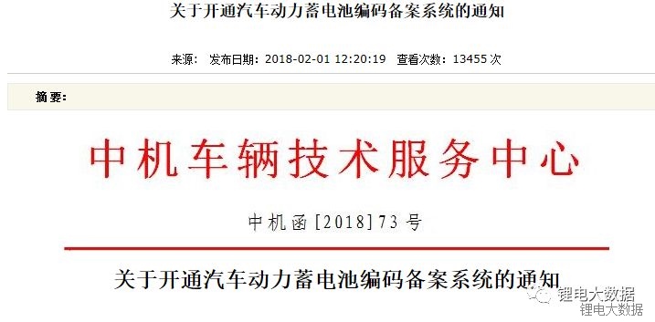 2月1日,中機中心發布《關于開通汽車動力蓄電池編碼備案系統的通知》,要求從事汽車動力蓄電池(含梯級利用)生產、在中國境內銷售動力蓄電池產品的獨立法人企業按照《汽車動力蓄電池編碼規則》(GB/T34014-2017)和通知的要求,通過“汽車動力蓄電池編碼備案系統”,申請廠商代碼,并備案編碼中“規格代碼”和“追溯信息代碼”的編制規則。