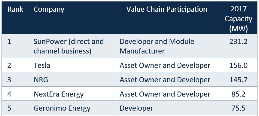 其中,SunPower、特斯拉和NRG能源占前三席,聯合占據2017年近四分之一的商用太陽能市場,每家企業的部署量都超過100兆瓦。