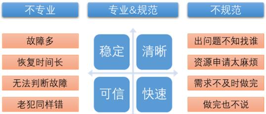 隨著業(yè)務(wù)發(fā)展,運(yùn)維的非專業(yè)性問題開始凸顯,這時候運(yùn)維強(qiáng)調(diào)專業(yè)分工和運(yùn)維作業(yè)規(guī)范且利用工具進(jìn)行業(yè)務(wù)調(diào)度,滿足運(yùn)維的方便透明、快速響應(yīng)、過程預(yù)警及質(zhì)量監(jiān)督的管理需求。