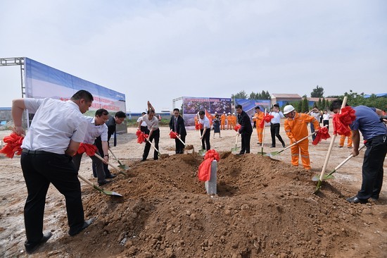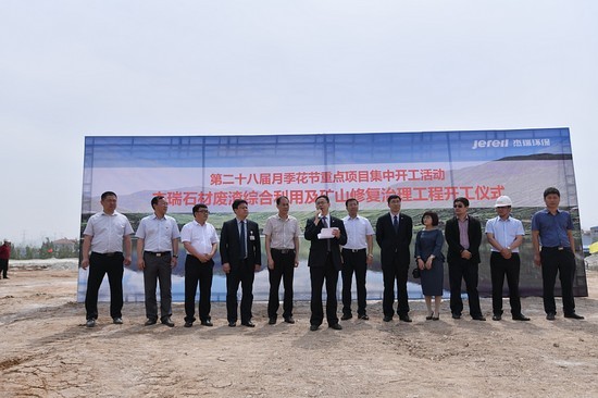 柞村鎮黨委書記楊棟、柞村鎮鎮長邱維興、全國綠色礦山聯盟理事長杜根杰、杰瑞環保集團董事長王丕學、杰瑞集團高級副總裁李雪峰、杰瑞設計院院長楊波出席項目開工儀式并為項目奠基。