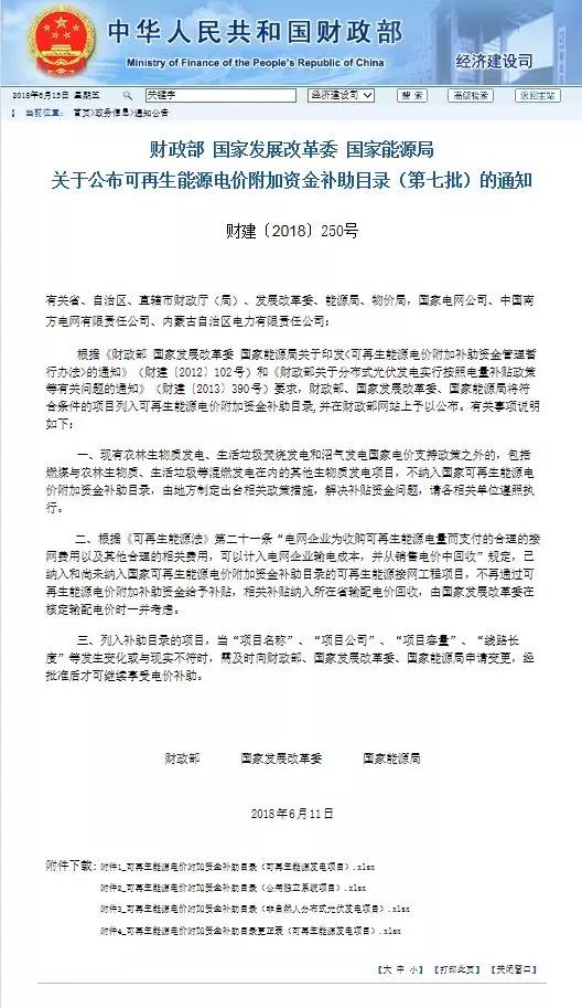 6月15日,財政部、國家發展改革委、國家能源局發布《關于公布可再生能源電價附加資金補助目錄(第七批)的通知 》(財建〔2018〕250號)(以下簡稱《通知》),要求相關方根據《財政部 國家發展改革委 國家能源局關于印發<可再生能源電價附加補助資金管理暫行辦法>的通知》(財建〔2012〕102號)和《財政部關于分布式光伏發電實行按照電量補貼政策等有關問題的通知》(財建〔2013〕390號),財政部、國家發展改革委、國家能源局將符合條件的項目列入可再生能源電價附加資金補助目錄,并在財政部網站上予以公布。