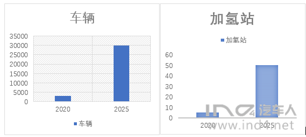 ? 2021-2025年:形成有國(guó)際影響力的整車企業(yè)1家、動(dòng)力系統(tǒng)企業(yè)2-3家、關(guān)鍵零部件企業(yè)8-10家,燃料電池汽車全產(chǎn)業(yè)鏈年產(chǎn)值突破1000億元。在示范運(yùn)行與推廣層面,建成加氫站50座,乘用車不少于2萬(wàn)輛、其它特種車輛不少于1萬(wàn)輛。